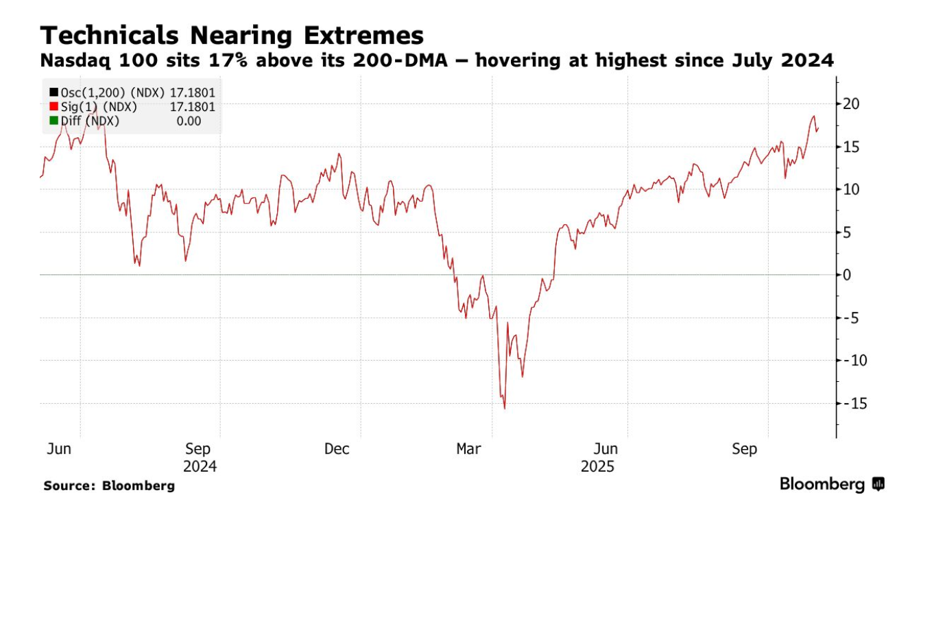 This chart shows two main things: 1) The rebound from the April lows was historic in its speed and magnitude. In fact, it is one of only seven such rebounds since 1950., 2) tech valuations are historically stretched, and warning signs of an overheating condition abound.